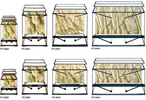 Le terrarium Exo Terra, conçu par des herpétologistes européens, est l'habitat idéal pour les reptiles et les amphibiens. Les portes avant facilitent l'entretien et le nourrissage. Un loquet est spécialement conçu pour empêcher les reptiles de s'enfuir et il permet d'ouvrir les portes séparément. Le couvercle grillagé entièrement amovible permet aux rayons U.V.B. et infrarouges de pénétrer et facilite l'accès pour décorer et nettoyer le terrarium. À l'arrière du couvercle grillagé, de chaque côté, se trouvent cinq entrées refermables pour fils et tuyaux. Cela simplifie l'installation de roches chauffantes Heat Wave, de cascades, de sondes, etc., dans le terrarium. La base du terrarium est élevée pour permettre d'installer une pellicule chauffante de substrat afin de chauffer une partie de la surface agrandie. La fenêtre du devant, placée très haut, est idéale pour ajouter des couches épaisses de substrat (pour les reptiles qui creusent), des accessoires aquatiques (paludarium) ou pour installer un abri Exo Terra pour reptiles. L'arrière-plan imitant des roches naturelles est de la même couleur que tous les accessoires de décorations Exo Terra (bols à eau, cascades, roches chauffantes, etc.) et fournit un objet de plus pour grimper.